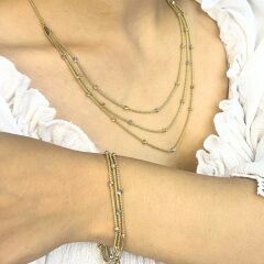 Bu 14 ayar altın dorikalı sıralı set takımı, zarif ve modern bir tasarıma sahiptir. Set, günlük kullanımdan özel günlere kadar mükemmel bir aksesuar olarak tercih edilebilir.
