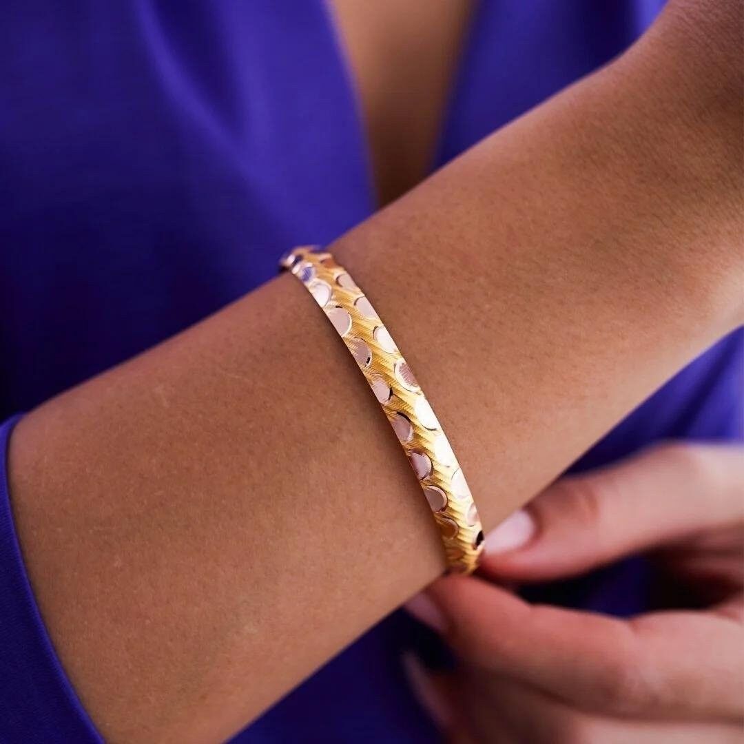 Evla Kuyumculuk'un 14 Ayar Altın İnce Bilezik, zarif ve şık bir görünüm sunan özel bir mücevherdir. Bu bilezik, yüksek kaliteli 14 ayar altından üretilmiş ve zarafetiyle öne çıkar. Bilezik, 14 ayar altından seçilerek üretilmiştir. 14 ayar altın, altının saflık süreleri olmayan bir derece olan 14 ayarda çalışır. Bu bilezikte kullanılan altın rengi, parlak bir görünüm sunar ve dayanıklı bir yapıya sahiptir. Kaliteli yayınlarla hazırlandı. Bileziğin ince tasarımı, zarafet ve şıklığı bir araya getirir. İnce yapısı, bileziği hafif ve rahat. Bileziğin her detayı işlenmiş ve incelikle tamamlanmıştır. İnce bilezikler, her türlü kıyafetle kombinlenebilir ve her durumda şıklığınızı tamamlar.