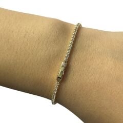Bu zarif ve göz alıcı 14 ayar altın su yolu bileklik, ince işçiliği ve parlak taş detayları ile şıklığınızı tamamlayacak harika bir aksesuardır. Su yolu tasarımı,\n\nBileklik boyunca sıralanmış taşlarla oluşturulan sürekli bir akış efekti verir . Işığı mükemmel bir şekilde yansıtır.\n\nÖzellikler:\n